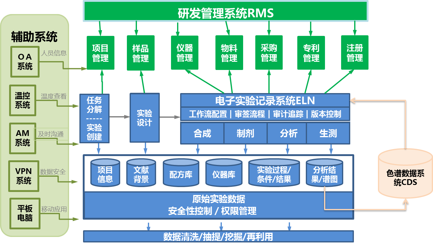 人福医药研究院实验室信息化平台以RMS系统和ELN系统为主,CDS系统、OA系统、温控系统、AM系统和VPN系统为辅,RMS系统中进行项目管理、样品管理、仪器管理、物料管理、采购管理、专利管理和注册管理;RMS项目管理模块分解的实验任务到ELN系统中,进行实验创建,并进行实验设计,然后在ELN系统中创建合成实验模板、制剂实验模板、分析实验模板、生物实验模板、中药实验模板和临床日志模板等各类实验记录,仪器产生的分析结果和谱图通过CDS调取到ELN系统中,ELN系统中实验记录填写完成后,根据工作流的配置,进行审签流程,完成实验记录。ELN中电子实验记录的积累,形成项目信息库、配方库、仪器库,通过安全性控制和权限管理,对原始数据进行安全管理,长期积累,可以对数据进行挖掘和再利用。